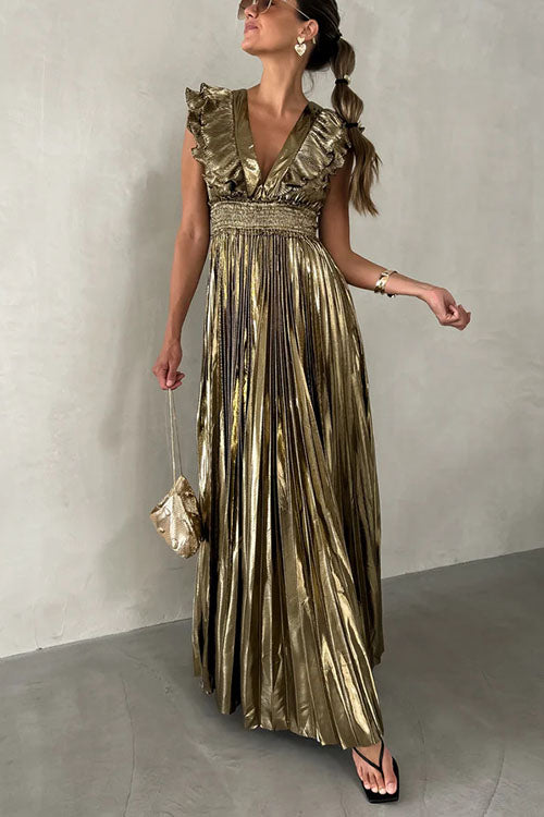 Rowangirl Solid Color V-neck Waist Lotus Leaf Sleeve Fashion Dress