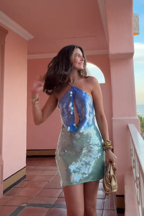 Rowangirl Sequined Temperament Halter Neck Backless Suspender Dress