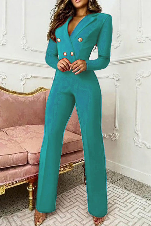 Rowangirl Fashion Lapel Long Sleeve Buttons Slim Suit Jumpsuit